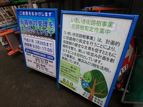 今回現場で掲示する看板には、横浜みどりアップのマスコットキャラクター「横浜みどりアップ葉っぴー」のイラストを入れました!