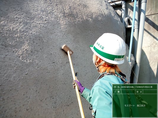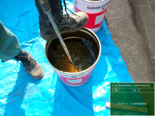 今回、モスグラフィティーの施工は初めてで、発注者の金沢区金沢土木事務所や塗料のメーカーと試作を行った上で施工しました。本物の苔を塗料に混ぜ込み、塗りつけている状態です。乾燥状態によって色は若干変化しますが、中の苔は水分を吸収して生きている状態を保つということです。