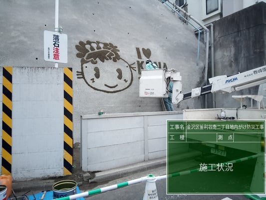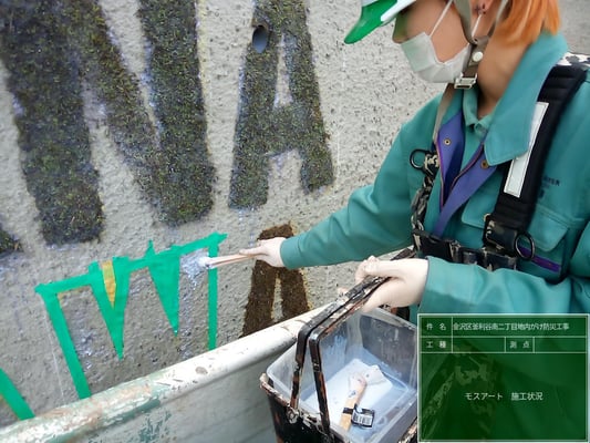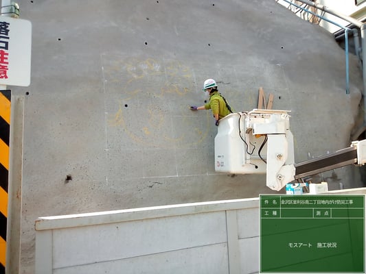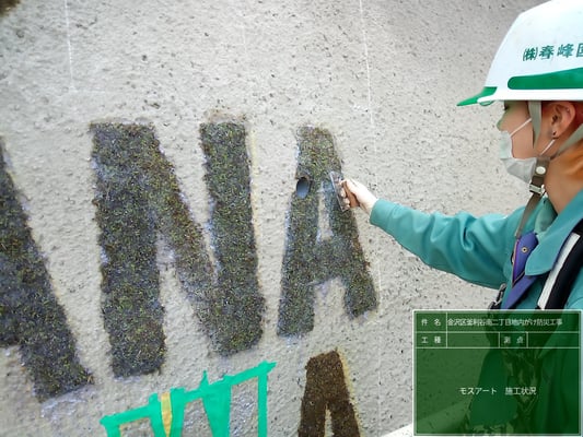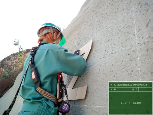 そして、現場環境改善の一環として、完成した吹付面に苔の塗料を使用した、モスグラフィティーを実施しました。
