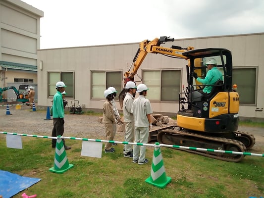 弊社ではチェンソーの使用体験とコンクリート小割圧砕アタッチメントの体験を行いました。チェンソーは授業でもあまり手にする機会が無いということでしたので生徒の皆様は興味深々であり少し怖さもあるような反応でした。